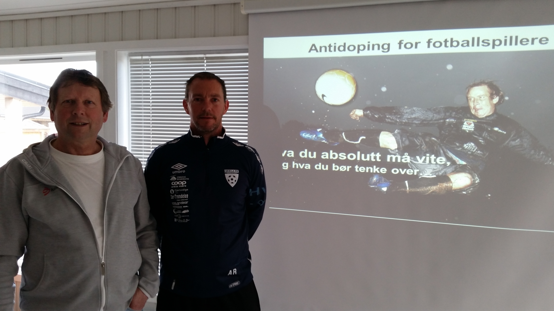 Orkla har hatt besøk fra Antidoping Norge/Rent Idrettslag, der budskapet var at det ikke er spørsmål OM Orklas utøvere blir oppsøkt for dopingkontroll, men NÅR dette besøket kommer! Doping er ikke forenelig med fotball og annen idrett og gjennom dette besøket fikk klubben ny kunnskap om hvordan doping kan forebygges og ikke minst hvilke konsekvenser det kan medføre å bli tatt for bruk av ulovlige stoffer. På bildet ser vi foredragsholder Oddbjørn Floan sammen med Orklas A-lagstrener Arnstein Røen.